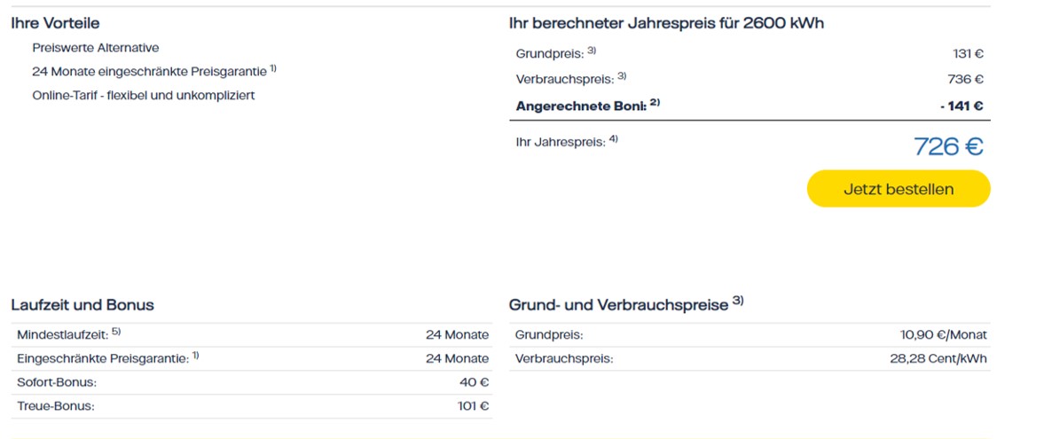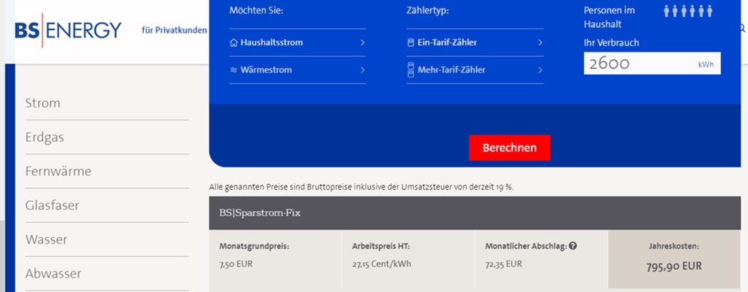 아래 B업체 홈페이지에 들어가면 마찬가지로, 1년치 예상 전력 사용량을 기입할수 있고 이에 따른 1년치 비용을 예상해볼수 있습니다. 이 업체의 경우 기본 요금이 월 10.9유로, KWh당 28.28센트로 책정이 되어있어 A업체보다 비싼것처럼 보입니다.