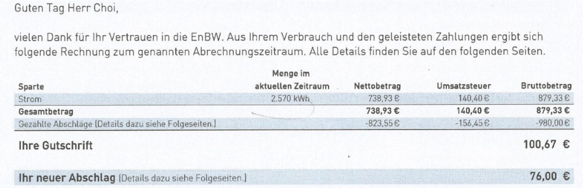 제가 살고 있는 슈트트가르트 (Stuttgart)에도 여러 전력 공급 업체가 있는데, 많은 사람들이 EnBW라는 업체를 이용합니다. 독일은 한국에 비해, 에너지에 대한 요금, 즉 물, 가스, 전기 요금이 꽤 비싼편입니다. 아래 사진을 예로 들어볼게요.