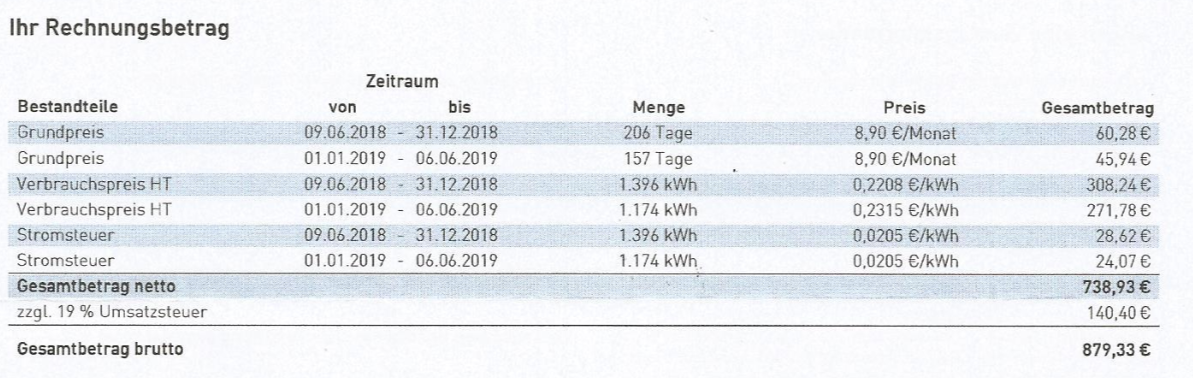 부가세 19퍼센트를 포함 (독일에서는 모든 부가세가 19퍼센트.....), 1년 동안 879.33유로를 사용했네요.1년간 한화로 약 114만원치의 전기를 사용한 셈입니다. 한국이었으면 동일 전력으로 한달에 3만원 정도를 사용했을 텐데....3배 정도 비싼것 같습니다.