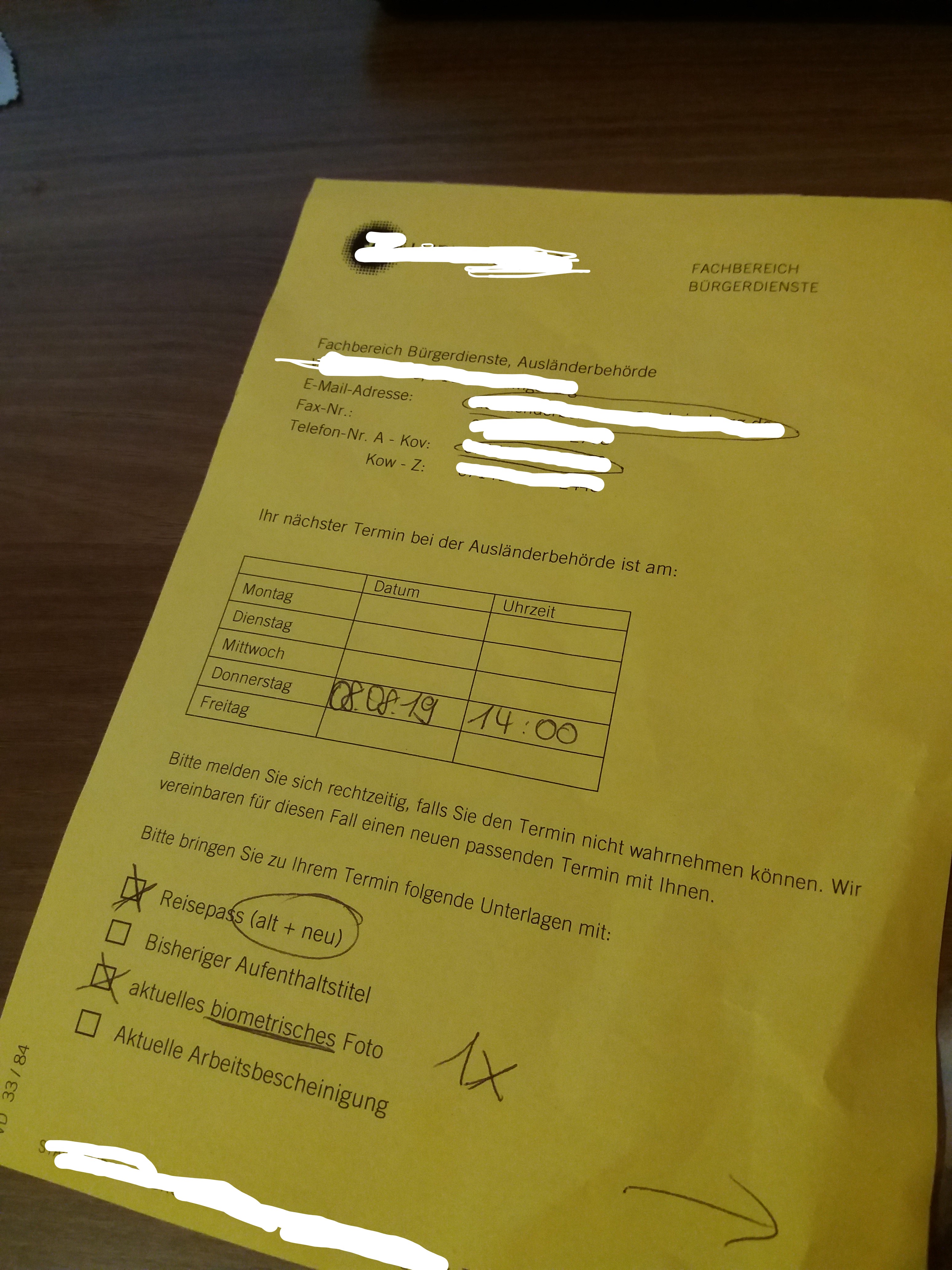 독일 생활하시면 아시겠지만, 독일 관공서, 은행, 보험사에 갈때에는 항상 미리 Termin(약속)을 잡고 가셔야 하는데 이것도 마찬가지입니다. Ausländerbehorde 에 가셔서 독일 비자를 신 여권에 새로 발급 받고싶다고 말씀하시면 이 서류 진행을 위한 Termin을 잡아줍니다. 한국 같았으면 바로 해주었겠지만 여기 독일에서는 상상도 못할 일이죠... 결국 Termin이 3주 뒤로 잡혔습니다. 아래와 같이 Termin 확인증을 주는데, 준비해야할 서류 목록도 적혀있습니다. 여권용 사진 1매와, 수수료 33유로를 가지고 오면 서류 처리가 가능하답니다.