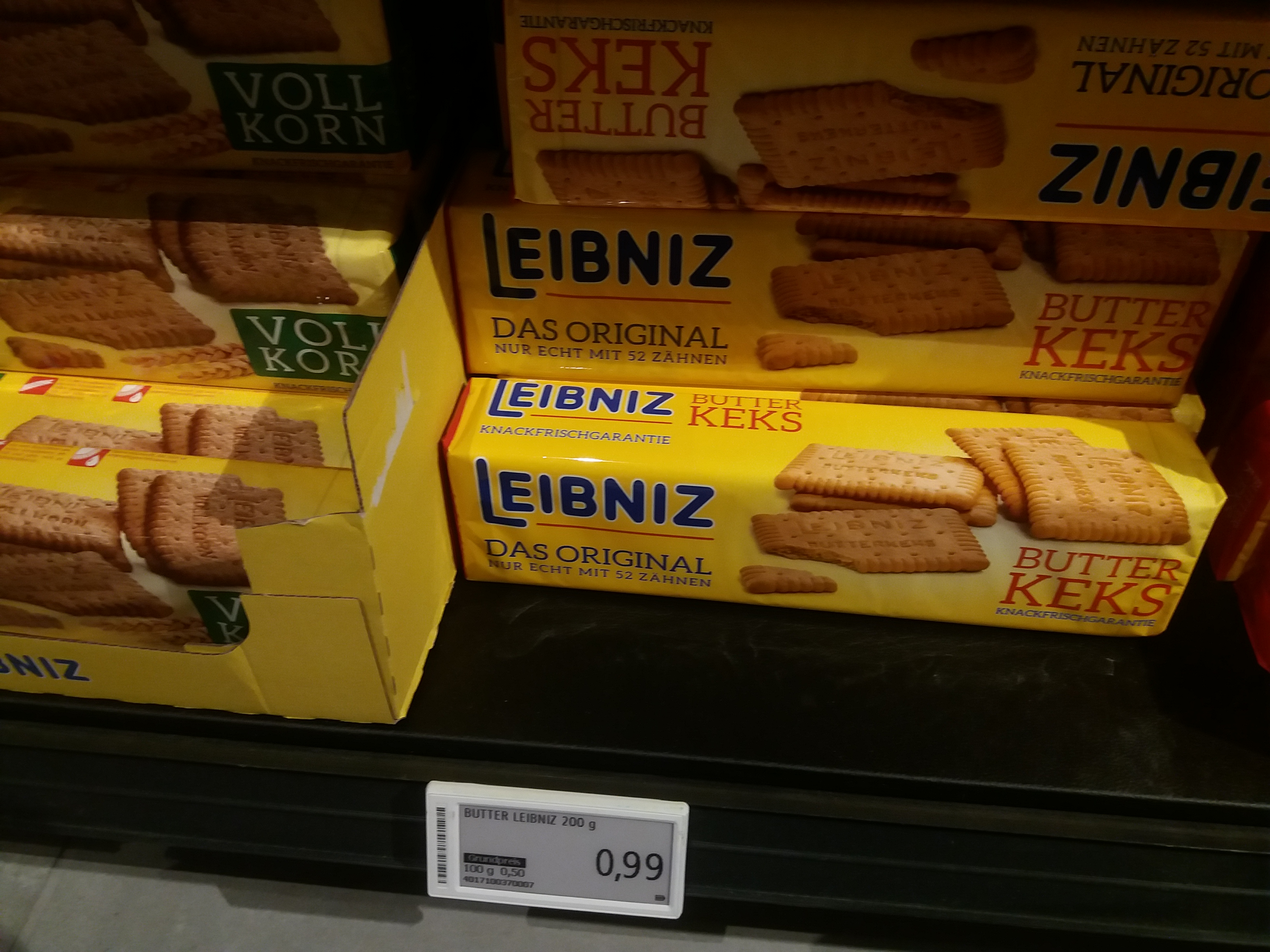 아래 과자는 독일 여행 오신분들이면 아실것 같은데요, 독일 국민 과자로 불리는 Leibniz 입니다. 이 과자는 독일 공항 면세점에서도 많이 볼수 있는데요 이 과자 가격도 0.99유로밖에 안합니다. 독일인들의 최애 Keks (과자)입니다.