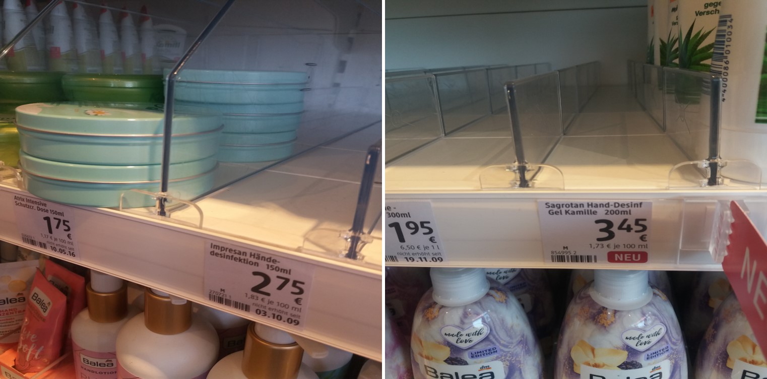 아래는 독일의 대표 드럭 스토어인 dm 매장의 손세정제 코너입니다. Hände-desinpektion 이라는 손소독제 코너에 가보면 이와 관련된 물품들만 품절인 것을 볼수 있습니다.