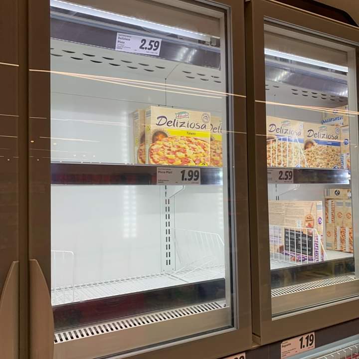 장기 보관 할수 있는 냉동 식품 또한 예외가 아닙니다. 독일 냉동식품의 메인을 차지하고 있는 피자한판들이 많이 팔리고 비어있는 것을 볼수 있습니다.