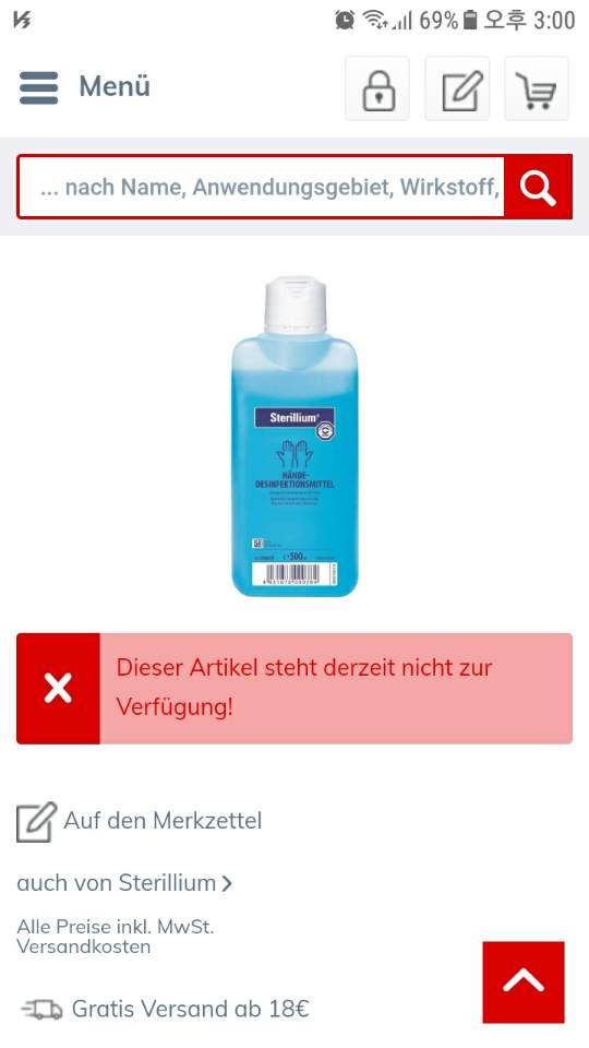손세정제 또한 마찬가지입니다. 독일의 모든 약국, 아마존 사이트에서 검색을 해봐도, 위 사진처럼 손세정제, 소독제는 모두 품절이라고 나옵니다.