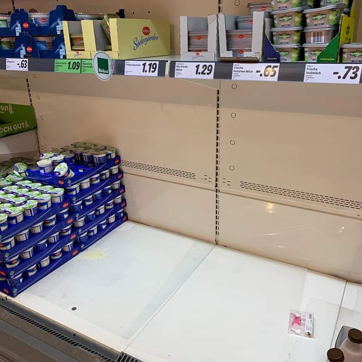 유제품류 코너 또한 많은 물품들이 비어있는데, 한국보다 독일의 유제품류는 유통기한이 긴 편으로 2주정도 되는편이라, 이 제품들도 사재기 품목 중 하나입니다.