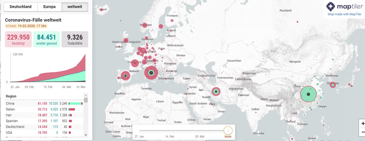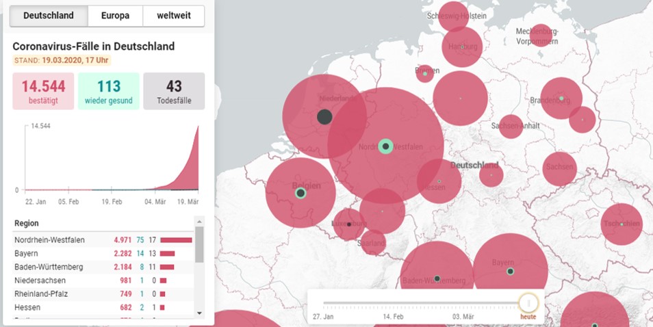 독일 코로나19 감염자가 하루만에 2천 명 이상 증가하며 3월 19일 기준 1만 4천명을 넘어섰다. 독일 일간지 모르겐포스트(morgenpost) 통계치에 의하면 3월 19일 오후 5시 기준 전체 감염자수 1만 4544명, 격리해제 113명 그리고 사망자 43명을 기록하였다.