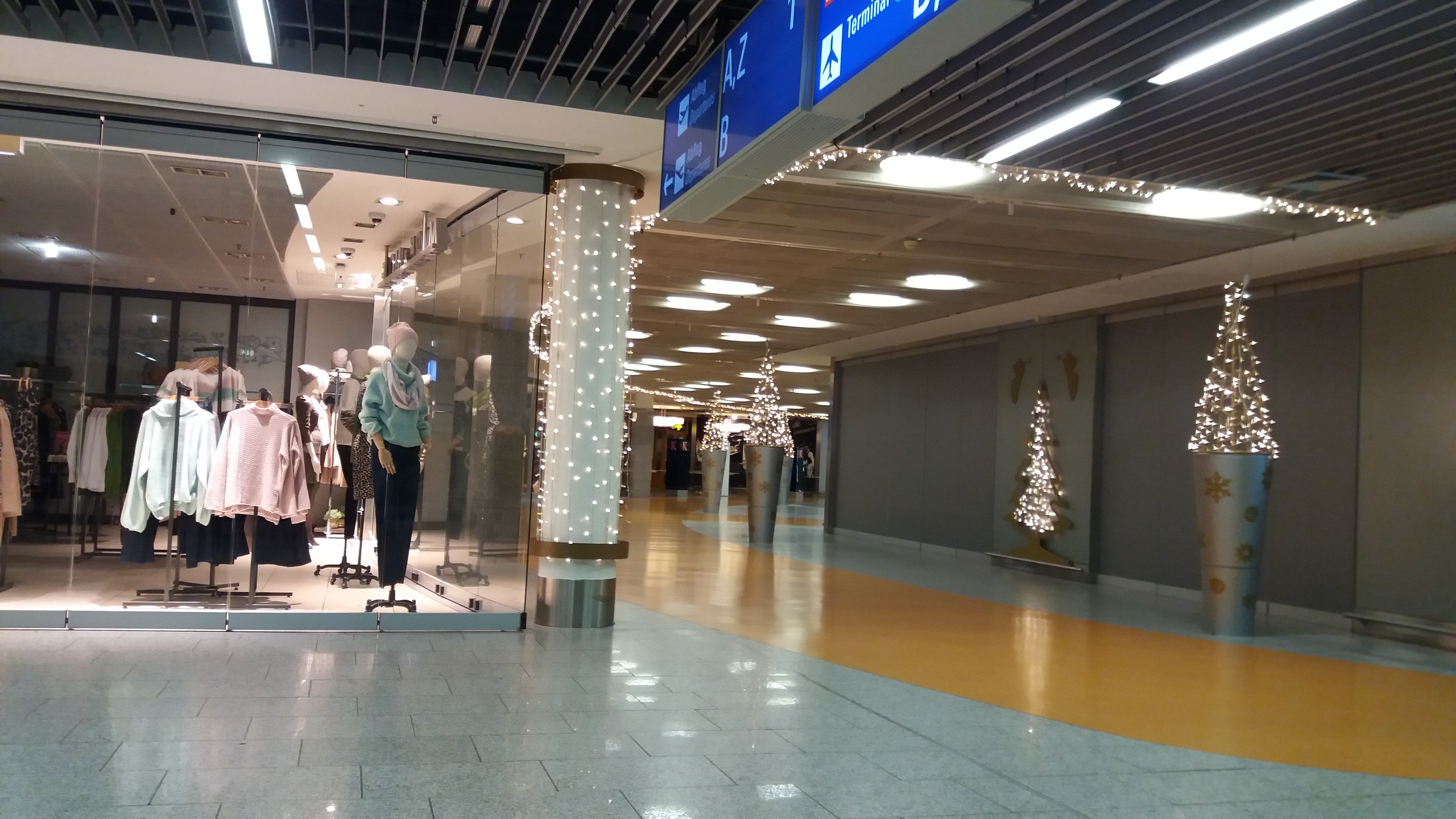 여러 개의 크리스마스 트리만이 쓸쓸하게 반짝이는 공항입니다.
