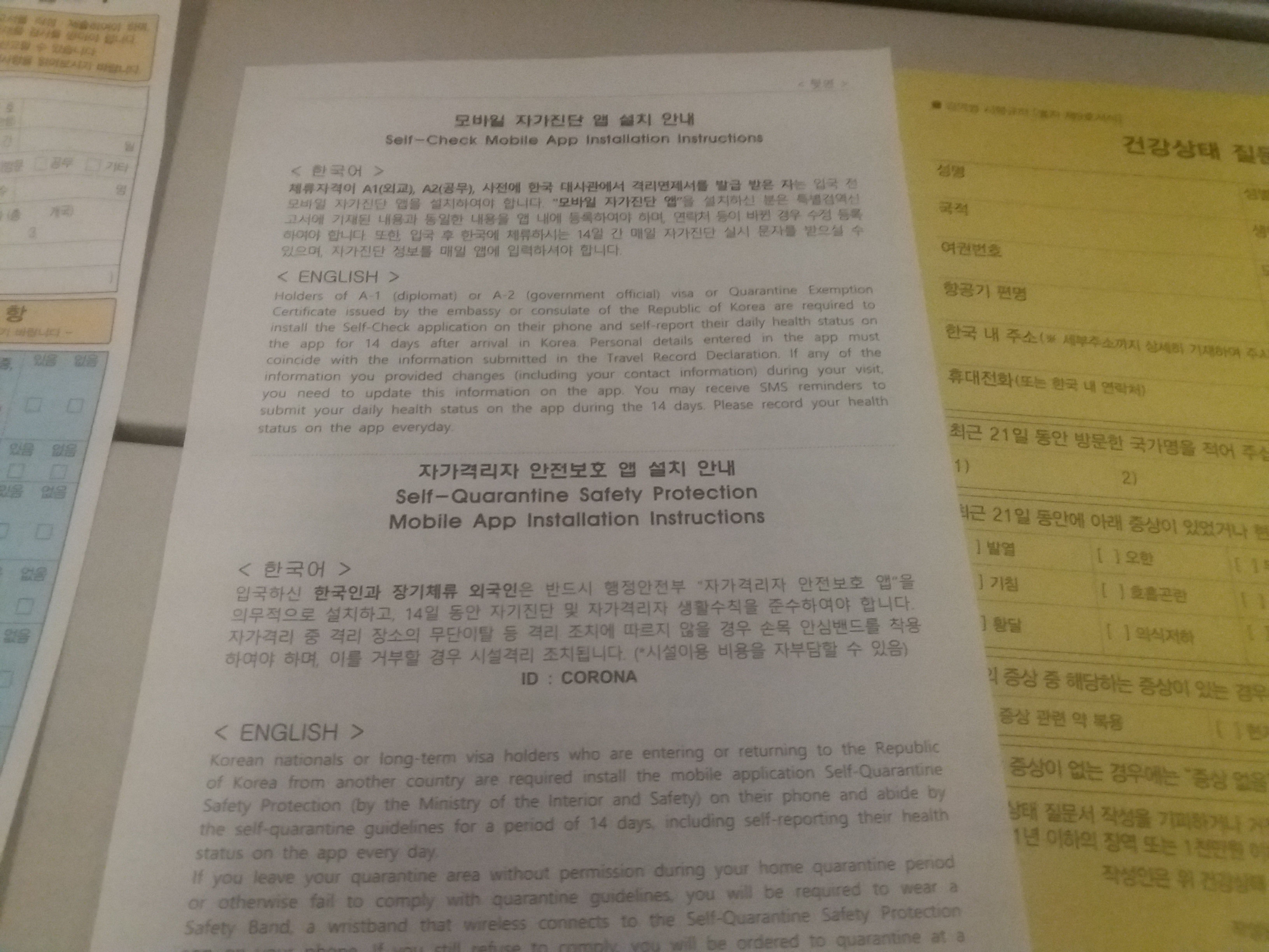 드뎌 오랜만에 고국의 땅을 밟았습니다! 코로나를 뚫고 어렵게 온 한국이라 그런지, 고국이 더 소중하게 느껴집니다. 해외 입국자 분들은 비행기에서 내리면 작성하신 서류를 하나 하나씩 제출하시게 되는데요, 우선 가장 먼저 해야할것은 체온 체크입니다. 그리고 나서는 자가격리 앱 설치 및 직원의 확인을 받으셔야하는데요, 앱을 설치하시고 개인 정보 및 자가격리 관련된 정보를 입력하신후 최종 확인 버튼을 누르시지 마시고 담당자분께 검토를 맡으셔야합니다.