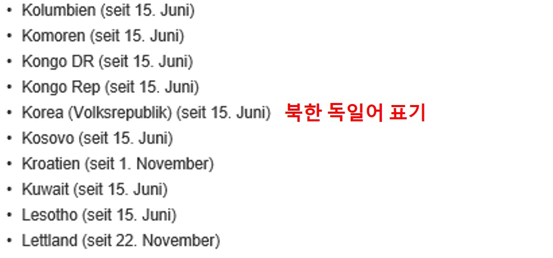 북한은 아래와 같이 Korea, volksrepublik 으로 표기하구요, 6월 15일부터 지속적으로 위험국가로 분류중입니다. 참고하세요!