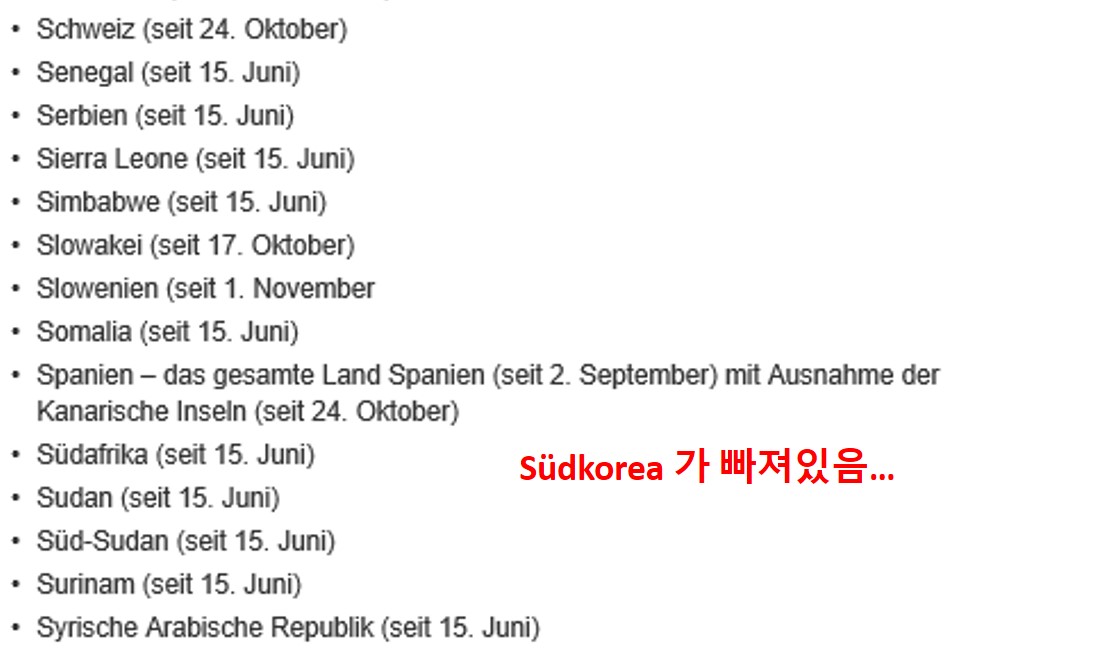 12월 11일자 로버트 코흐 연구소 정보에 의하면, 한국은 아직 코로나 바이러스 위험 국가가 아닙니다. 간혹 한국이 위험국가라고 오해하시는 분들이 있는데, 그분들은 한국의 독일어 표기를 북한이랑 헷갈리고 계시더라구요.