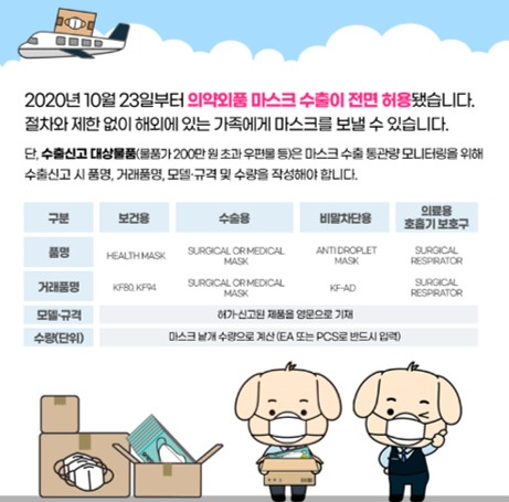 한동안 한국에 코로나 바이러스 초기, 마스크 대란이 일어났을 때 마스크 해외 배송 및 반출에 굉장한 제약이 있었는데요. 지금은 어떨까요?