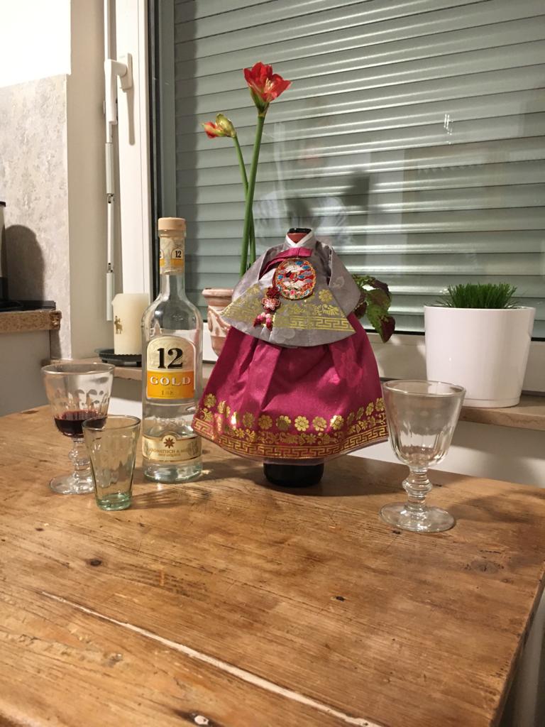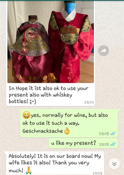 독일 예전 집주인 가족과, 아랫집 아주머니에게 선물을 드렸더니 너무나도 좋아했습니다. 정말 선물이 너무 마음에 든다고. ㅎㅎ 특히 아랫집 아주머니께서는 메세지로 사진까지 보내주셨고, 그 기뻐하는 마음이 메세지에서도 느껴지더라구요. 아랫집 아주머니는 와인도 좋아하셨지만, 슈납스 라는 독일 술 애호가입니다. 그 집에 놀러가면, 항상 새로운 맛의 슈납스를 마실수 있었죠. 그래서 제가 선물한 한복 와인 커버를 슈납스 병에 보관하셨더라구요. 그래서 한복위로 튀어나와야할 병목 부분이 짧더라구요 ㅎㅎㅎ