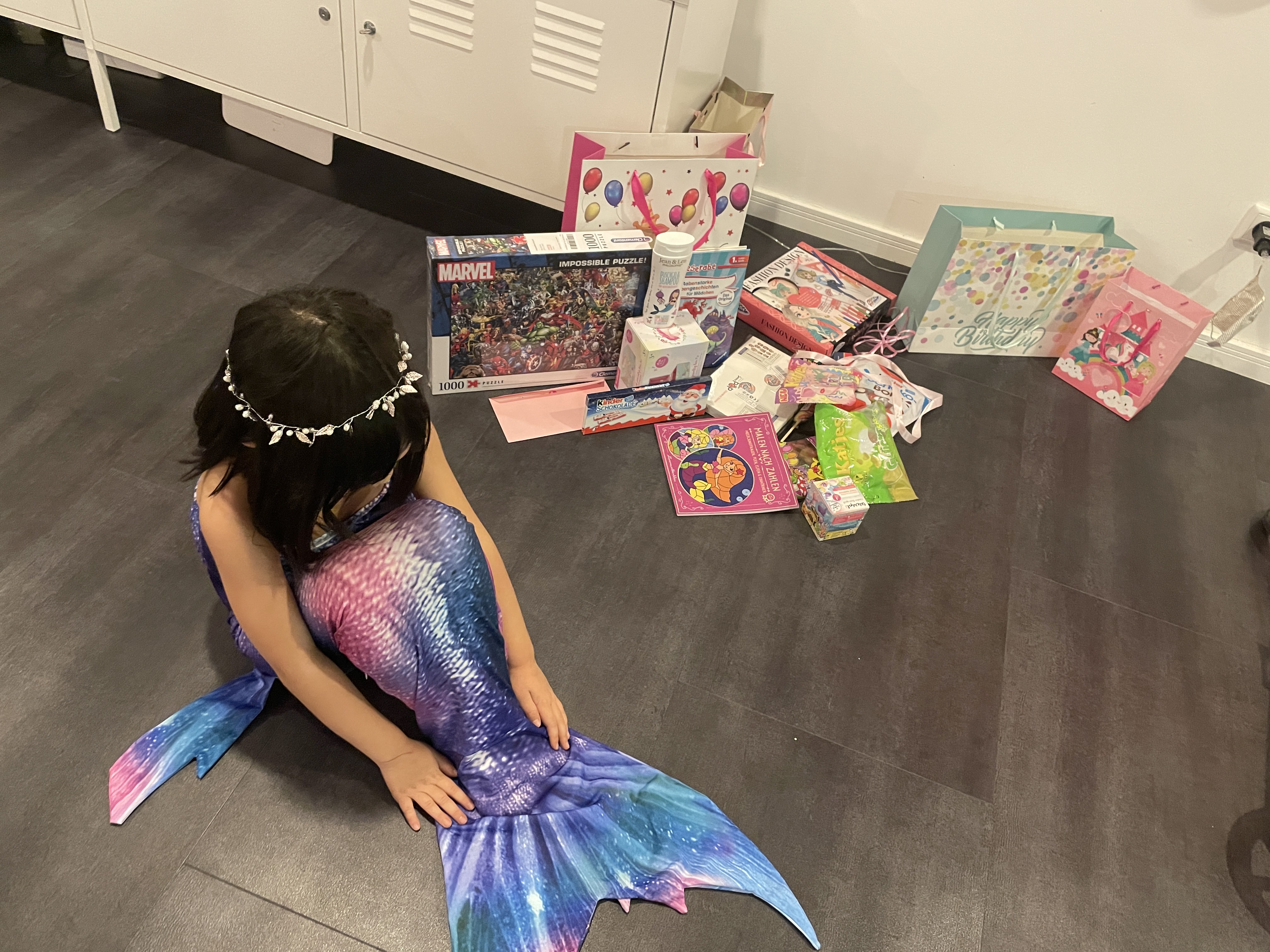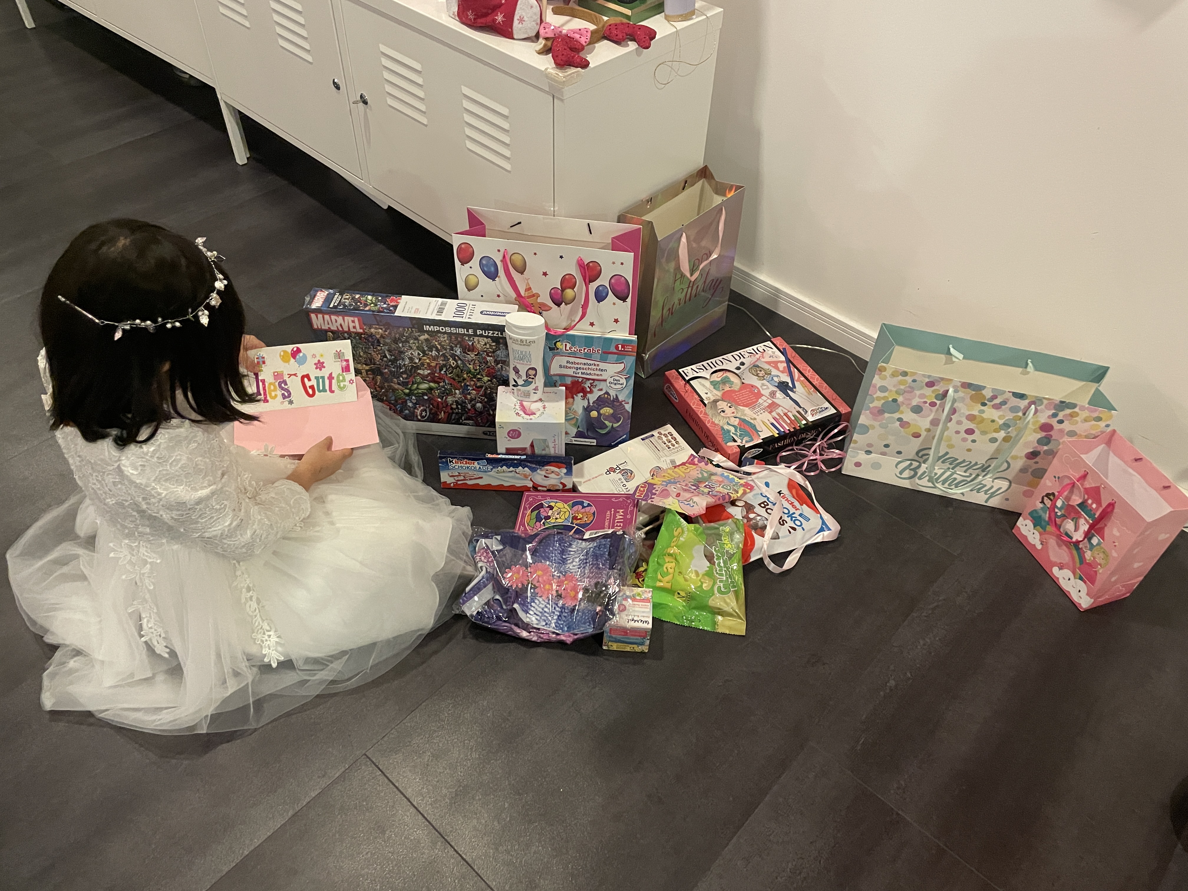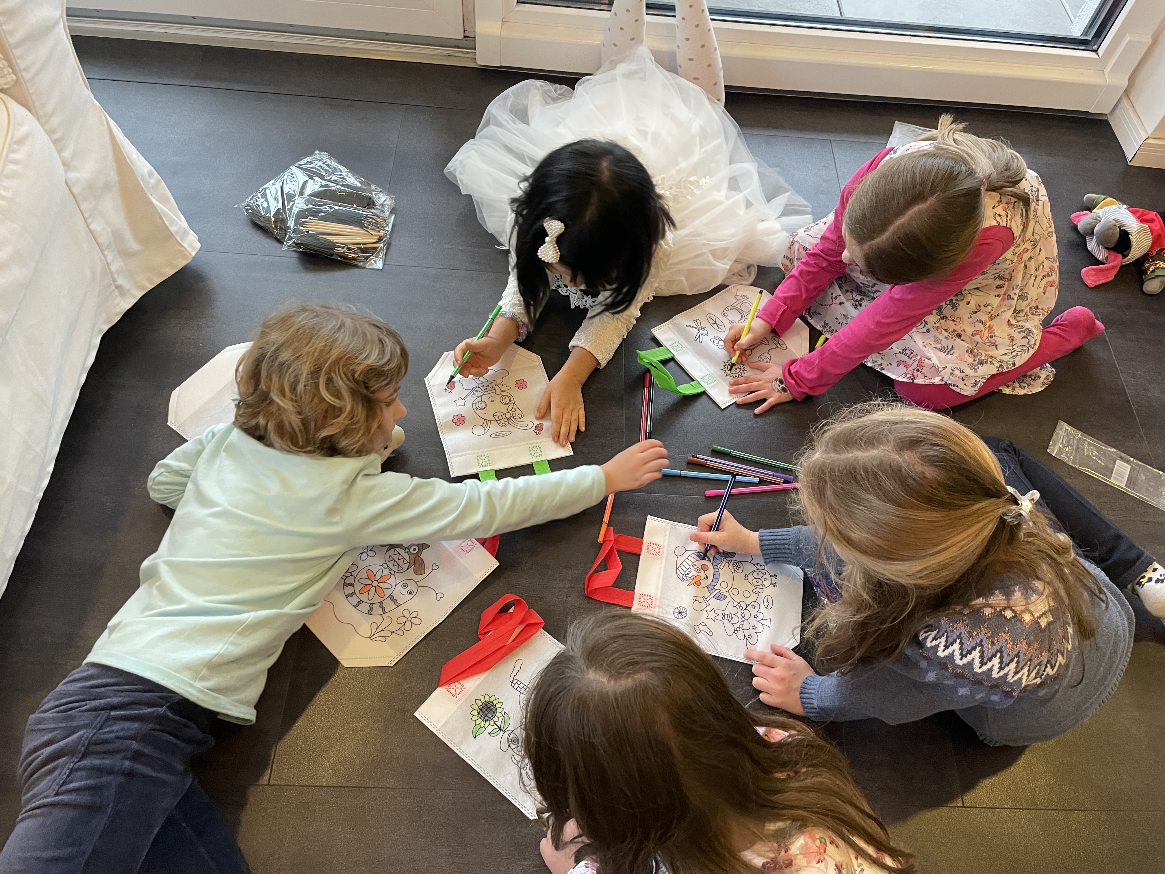정해진 픽업 시간 저녁 7시가 되자, 다시 초인종이 울리기 시작합니다. 엄마 아빠들이 아이들을 데리러 오자, 아이들 얼굴에 잔뜩 우울함과 짜증이 묻어납니다. 그만큼 아이들이 시간 가는 줄 모르고, 저희 아이 생일 파티때 놀았다는 거겠죠? 이렇게 생일 파티를 마치고 집에 가는 아이들에게, 자그만한 기념품을 여러 개 선물 봉투에 담아주었습니다. 독일 아이들 생일 파티의 기본적인 것이죠.