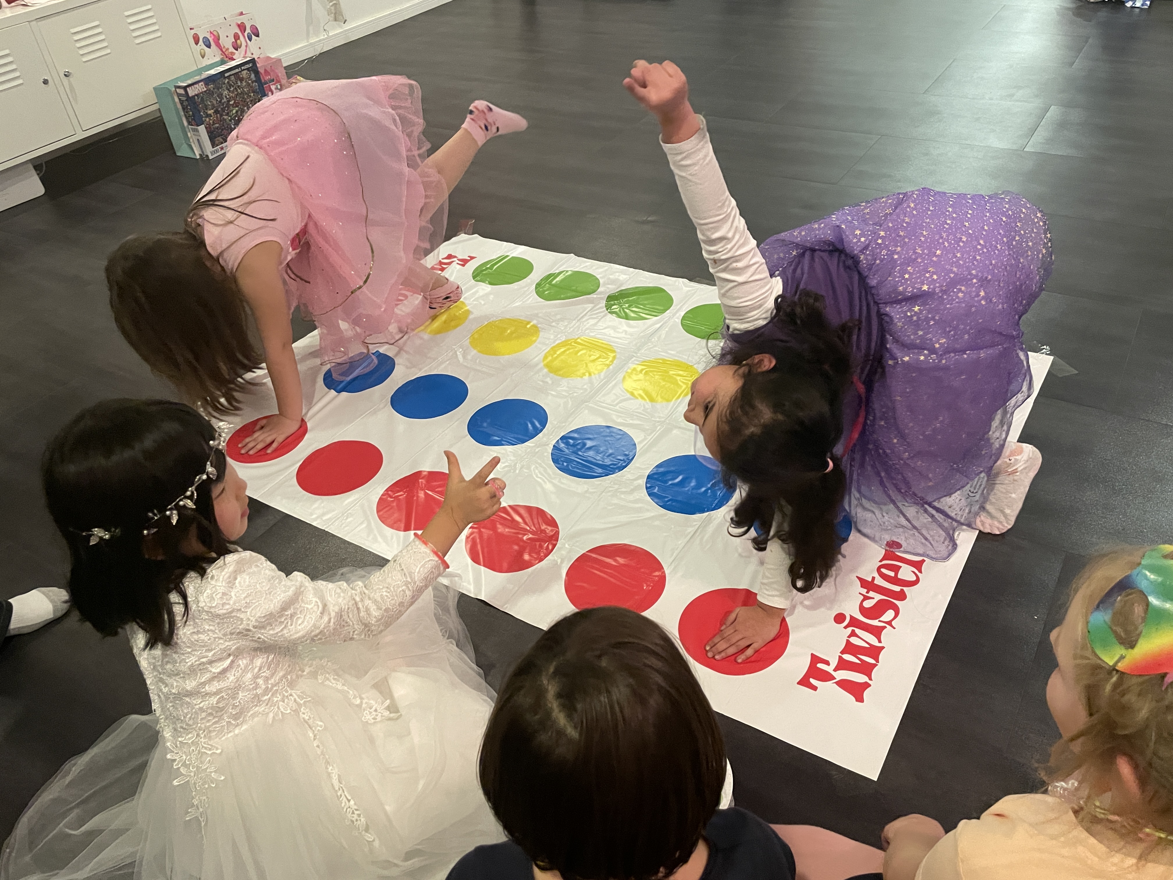 생일 파티의 마지막 프로그램! 또 다른 보드게임, 트위스터입니다. 아마 한국 TV 예능 프로그램에서 몇번 나와서 잘 아실텐데요, 이것만큼 아이들의 체력을 확 빼 버리는 보드게임도 없을 겁니다... 그래서 엄마 아빠들이 가장 좋아하는 보드게임이기도 하죠.... (아이들이 금방 지쳐서 잠투정 안하고 밤에 일찍 잠에 들수 있으니...)