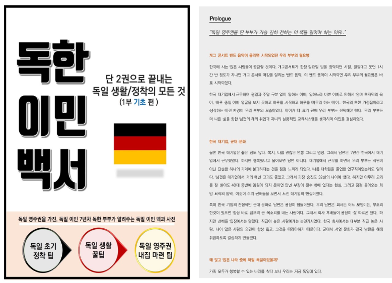 저희 독한 부부가 쓴 첫 전자책 ! 독일 이민에 관련된 기초 정보가 상세히 기록된 책입니다. 독일로 떠나기 전 한국에서 준비해야 할 서류 목록 및 신청 절차부터 독일 도착 후 정착에 필요한 모든 과정을 사진과 함께 자세히 적어보았습니다.